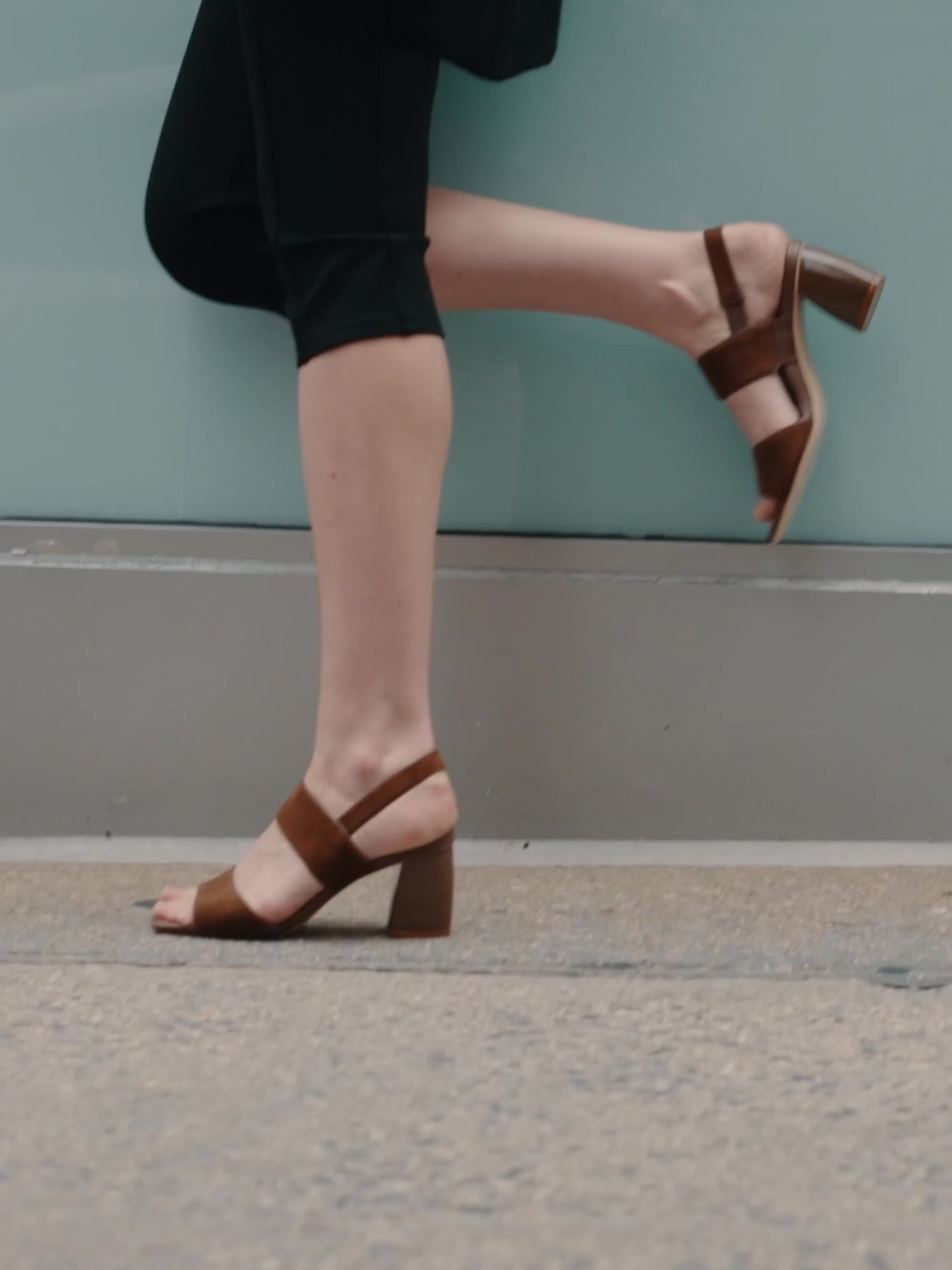 Side view of a mocha brown suede block heel sandal, shown on a model.
